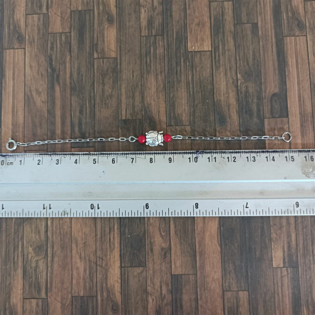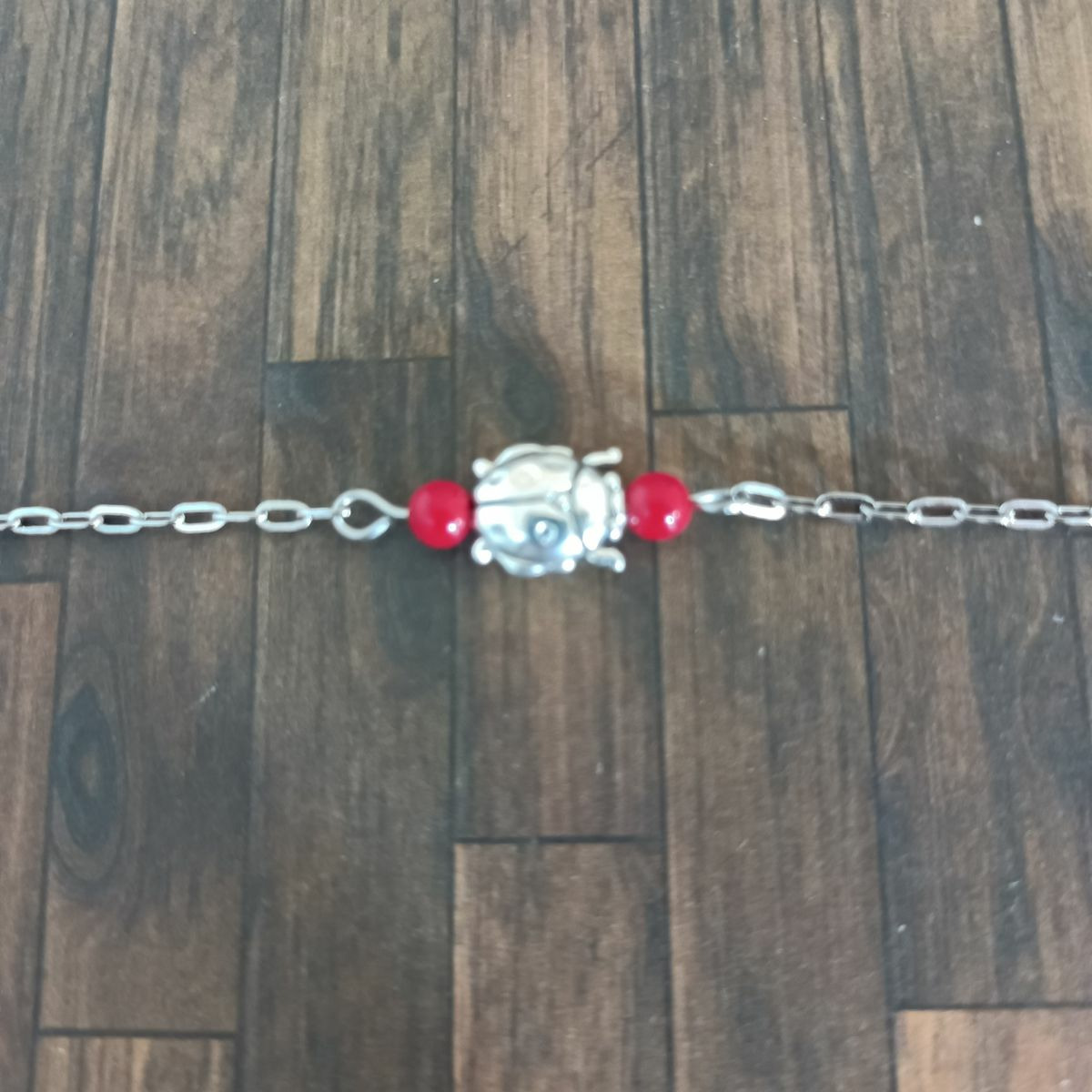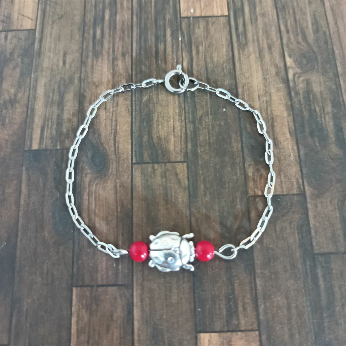Bracelet enfant en acier inoxydable et deux perles corail rouge de 4mm.