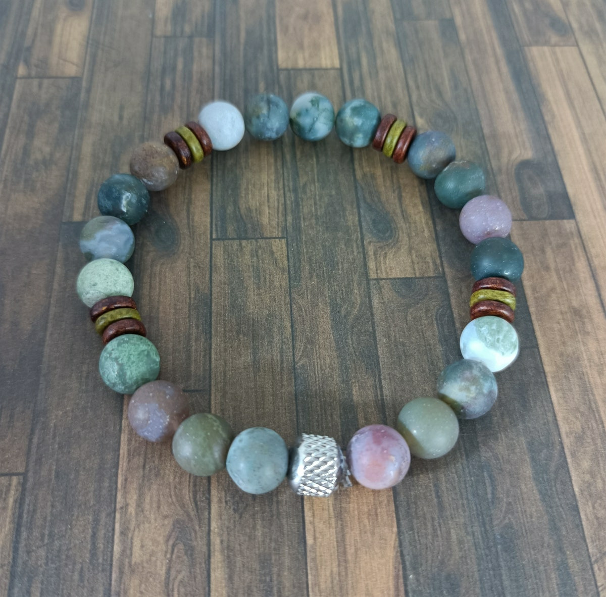 Perles d'espacement en acier inoxydable et perles plates morron/kaki en céramique.