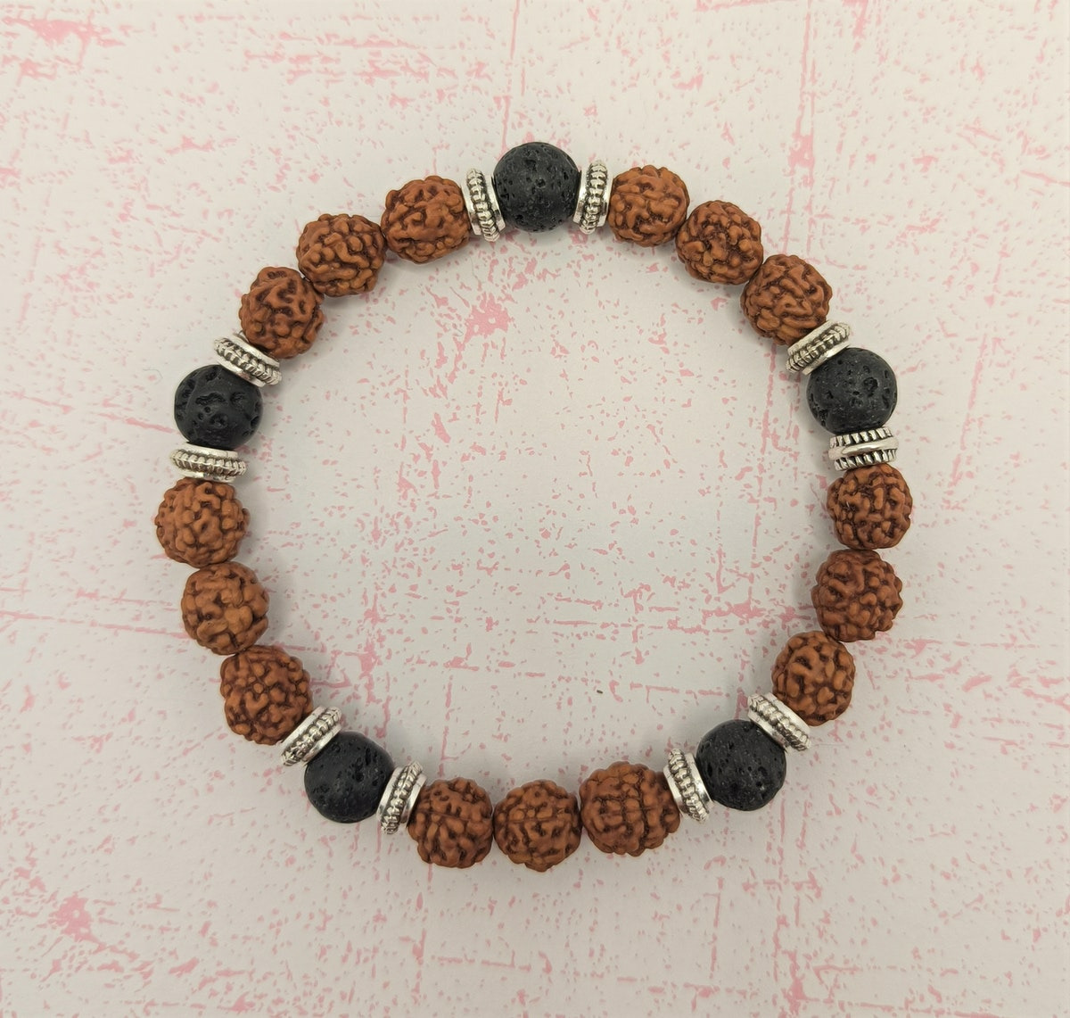 Bracelet homme perles de noyer/pierre de lave argenté