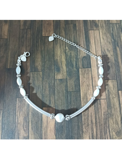 Bracelet avec une perles de culture, des perles de coquillage, perles d'espacement en argent antique, perles tiges en acier inoxydable et fermoir/chaîne d'extention en argent.