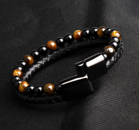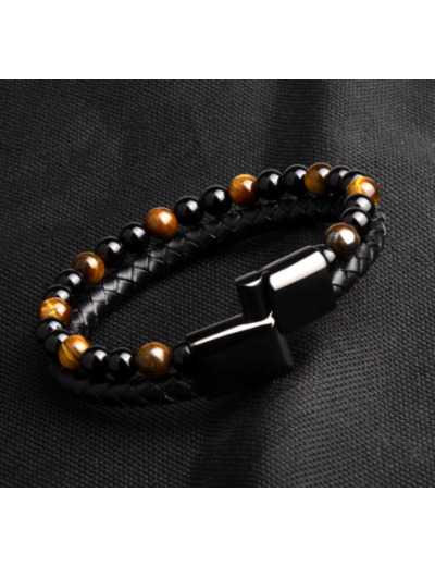 Fermoir magnétique noir en acier inoxydable et perles œil de tigre.