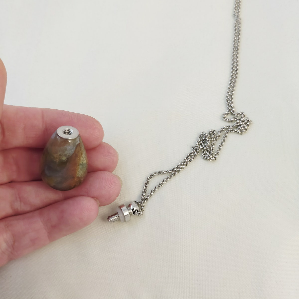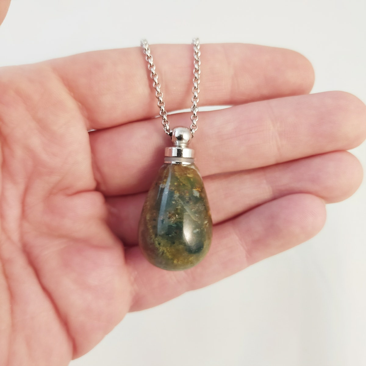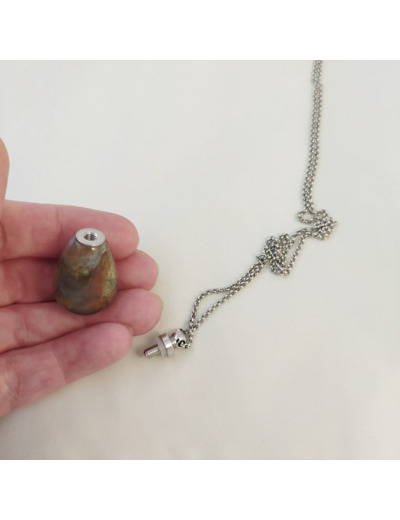 Ce bijou se présente comme un flacon de parfum minimaliste attaché à une chaîne en acier inoxydable. Le bouchon du flacon se devise pour permettre le remplissage de votre parfum. Original et raffiné, il est parfait à accumuler ou à porter en solo. Chaque pierre naturelle est unique, votre collier le sera aussi !