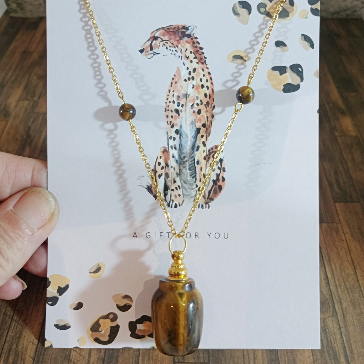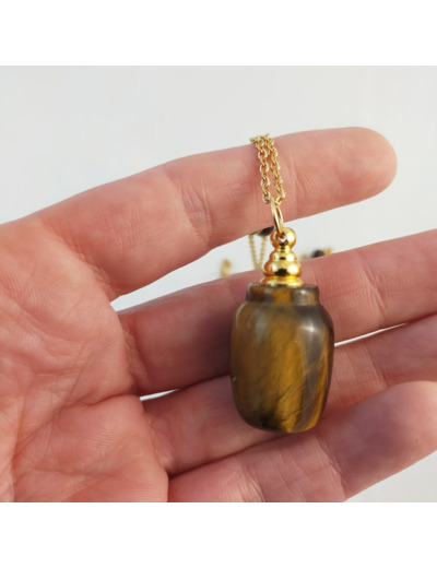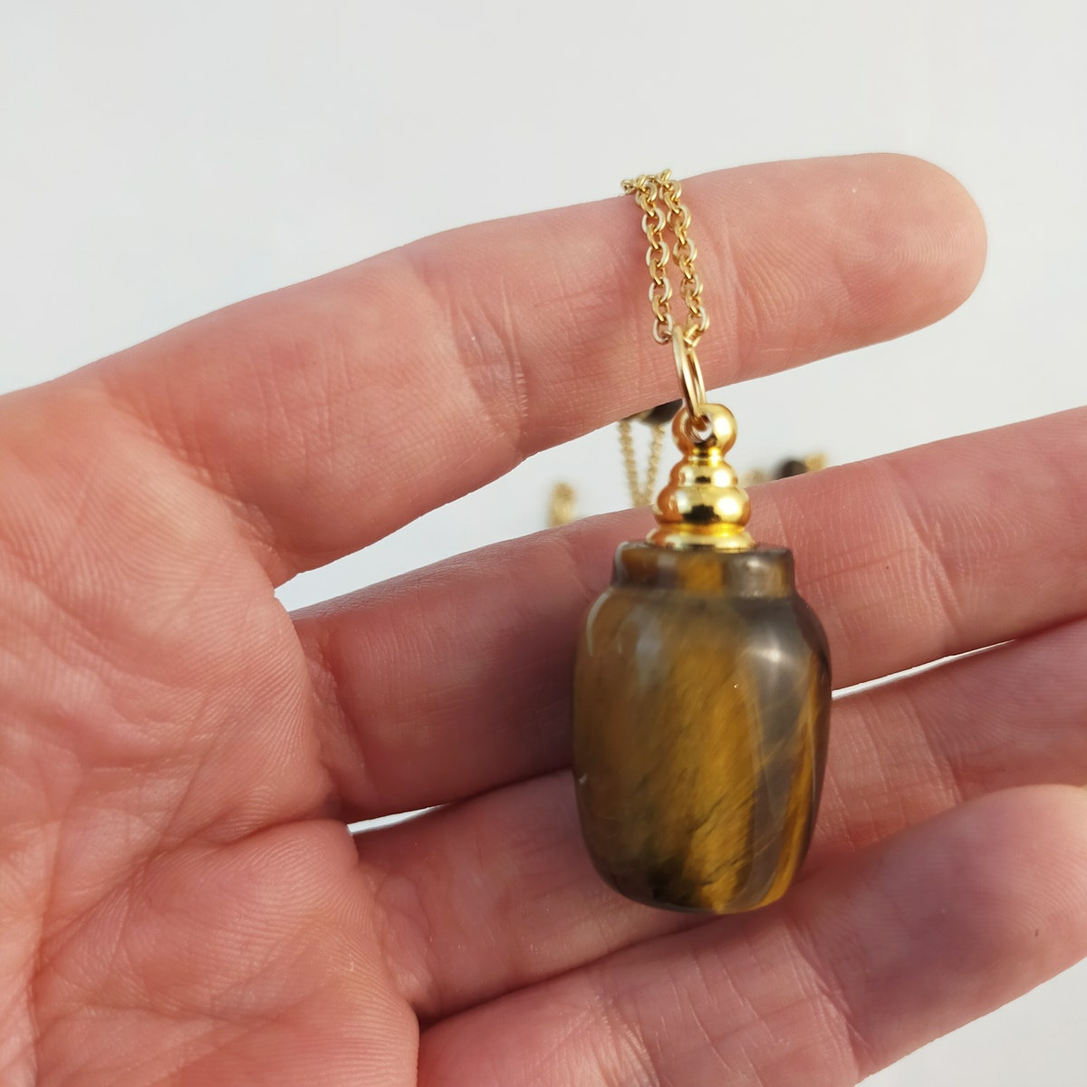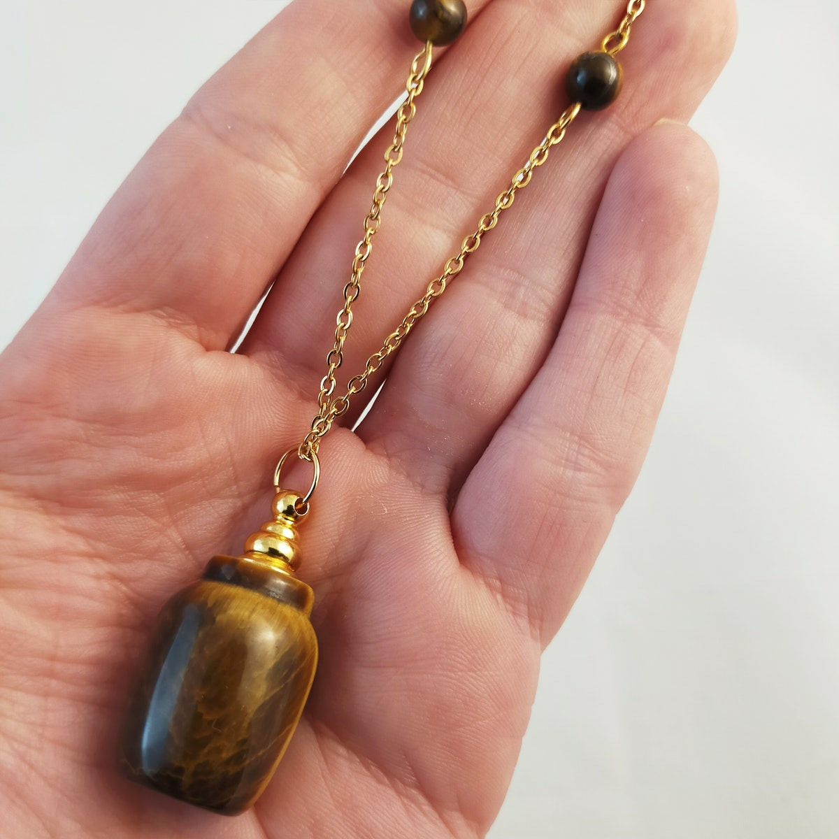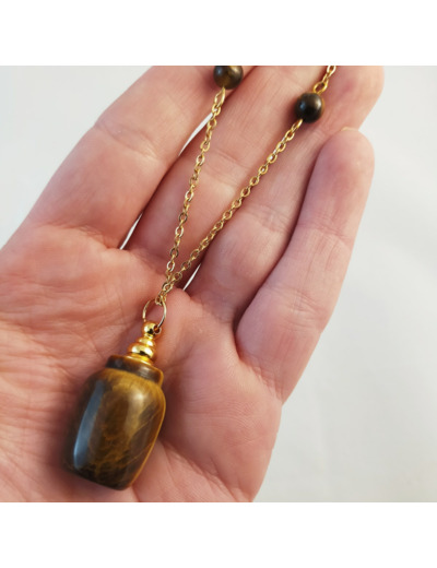 Ce bijou se présente comme un flacon de parfum minimaliste attaché à une chaîne en acier inoxydable et perles en pierres naturelles d'oeil de tigre. Le bouchon du flacon se devise pour permettre le remplissage de votre parfum. Original et raffiné, il est parfait à accumuler ou à porter en solo. Chaque pierre naturelle est unique, votre collier le sera aussi !