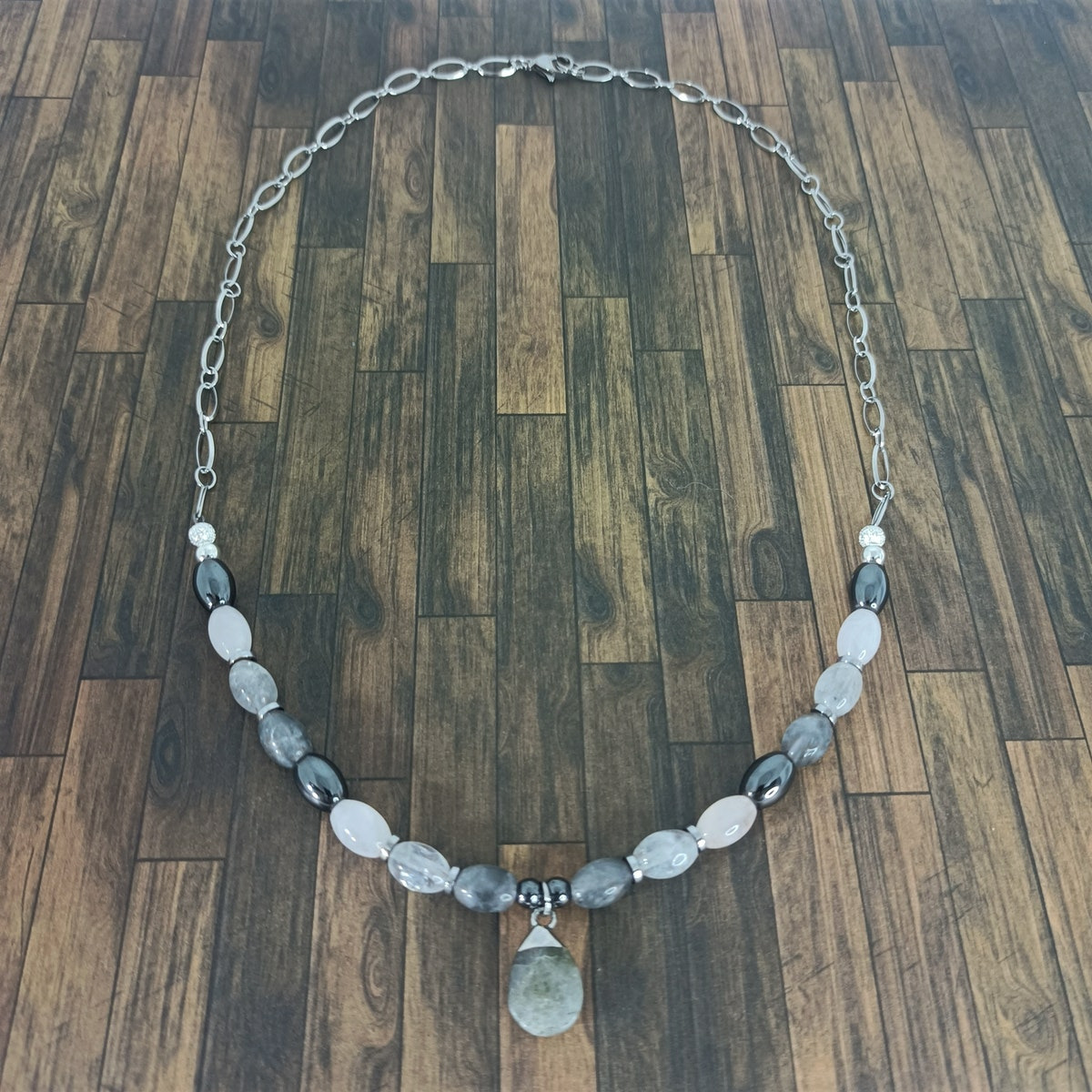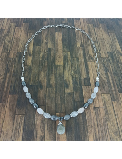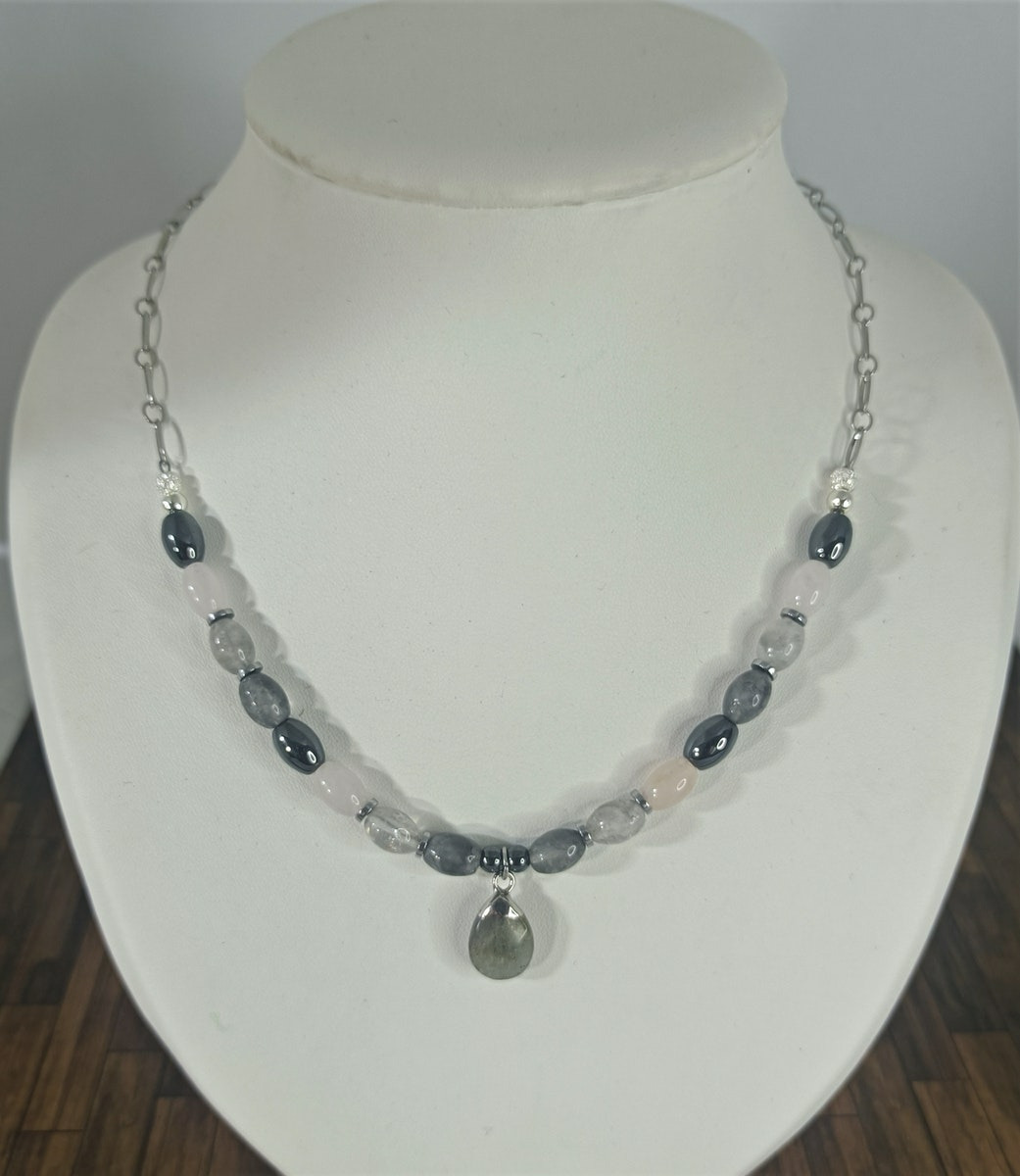 Collier en perles naturelles de labradorite, quartz rose et hématite.