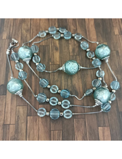 Perles de verre bleu ciel et chaîne en acier inoxydable.
