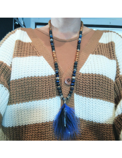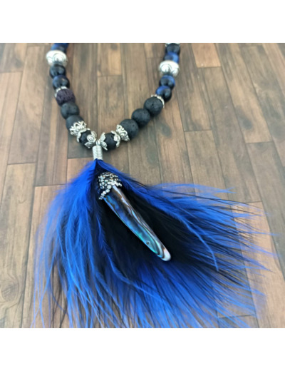 Perles de bois de pin, perles de pierre de lave, perles oeil de faucon, perles en métal argenté, pendentif ormeau, plumes noire et bleu, monté sur fil élastique de 1mm.