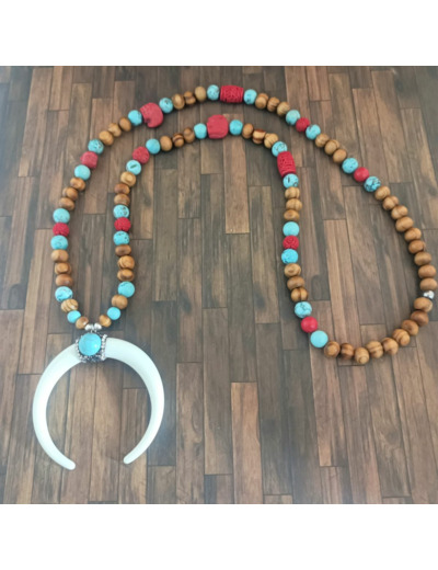 Perles de bois de pin, perles howlite turquoise, perles oeil de faucon, perles en métal argenté, pendentif ormeau, plumes noire et bleu, monté sur fil élastique de 1mm.