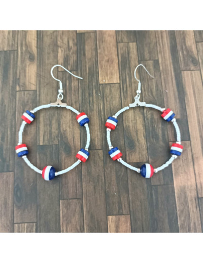 Perles acryliques aux couleurs de la France, perles miyuki blanches et créoles en acier inoxydable de 4cm de diamètre.
