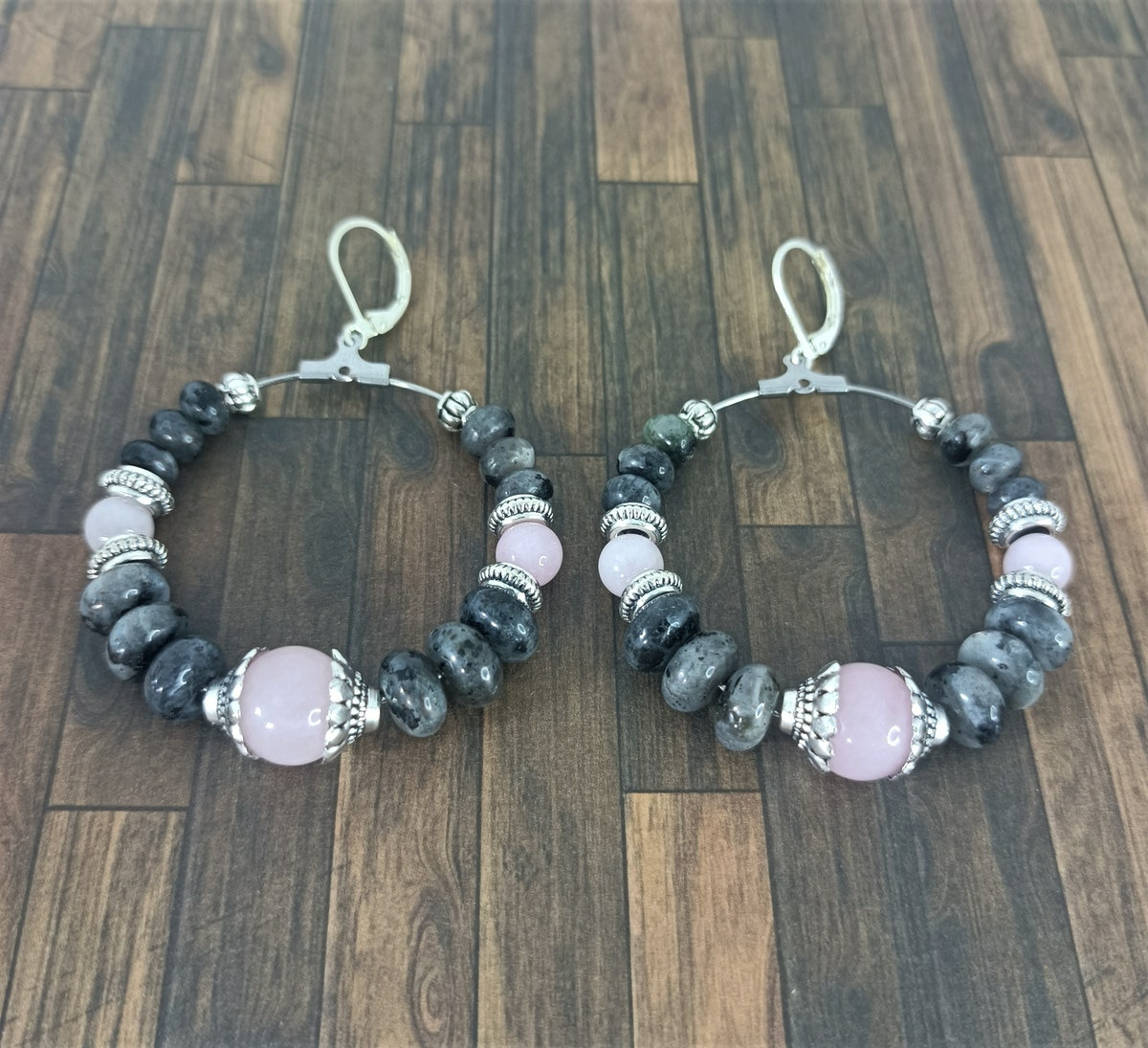 Créoles labradorite/quartz rose argenté Ø 4 cm