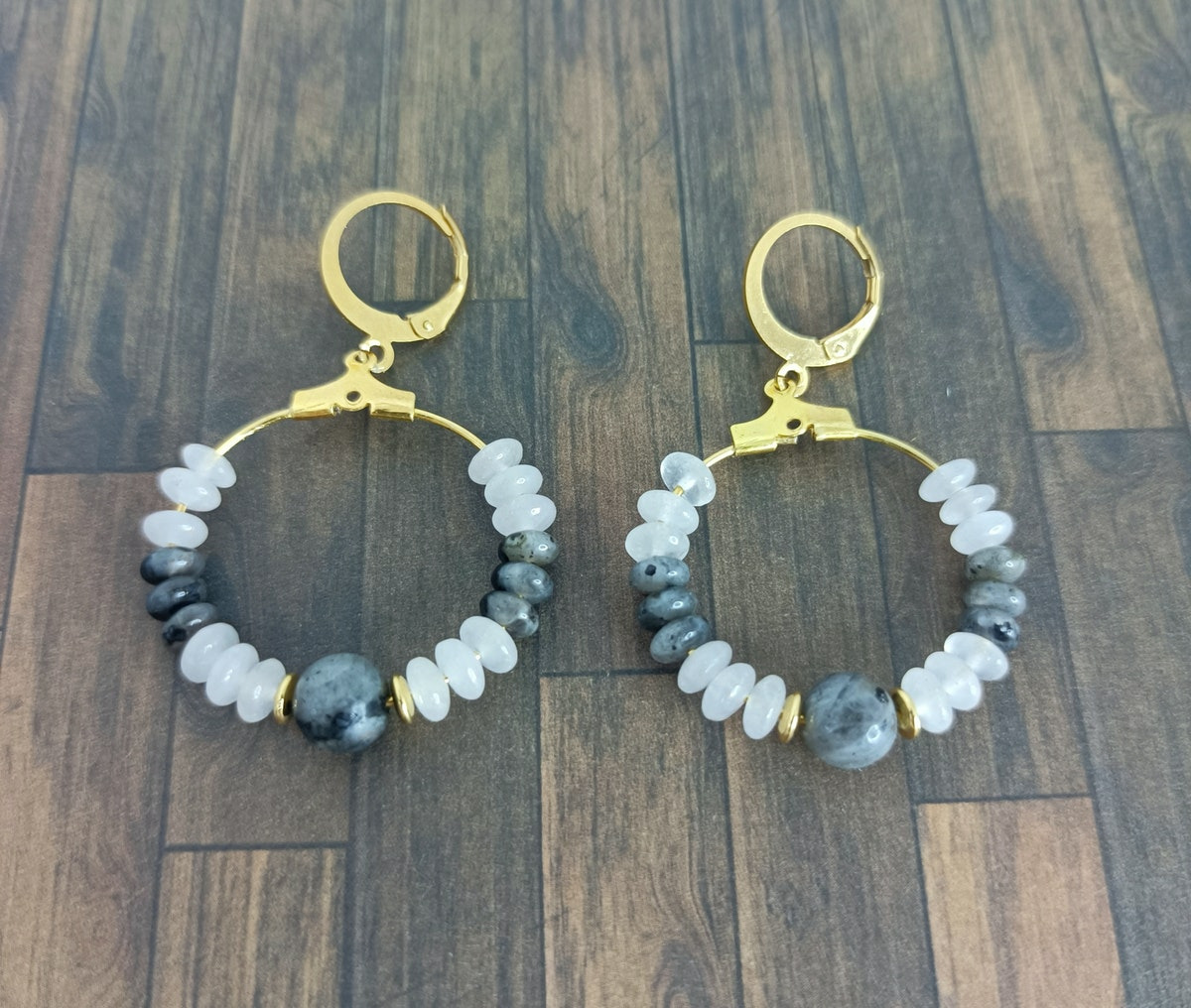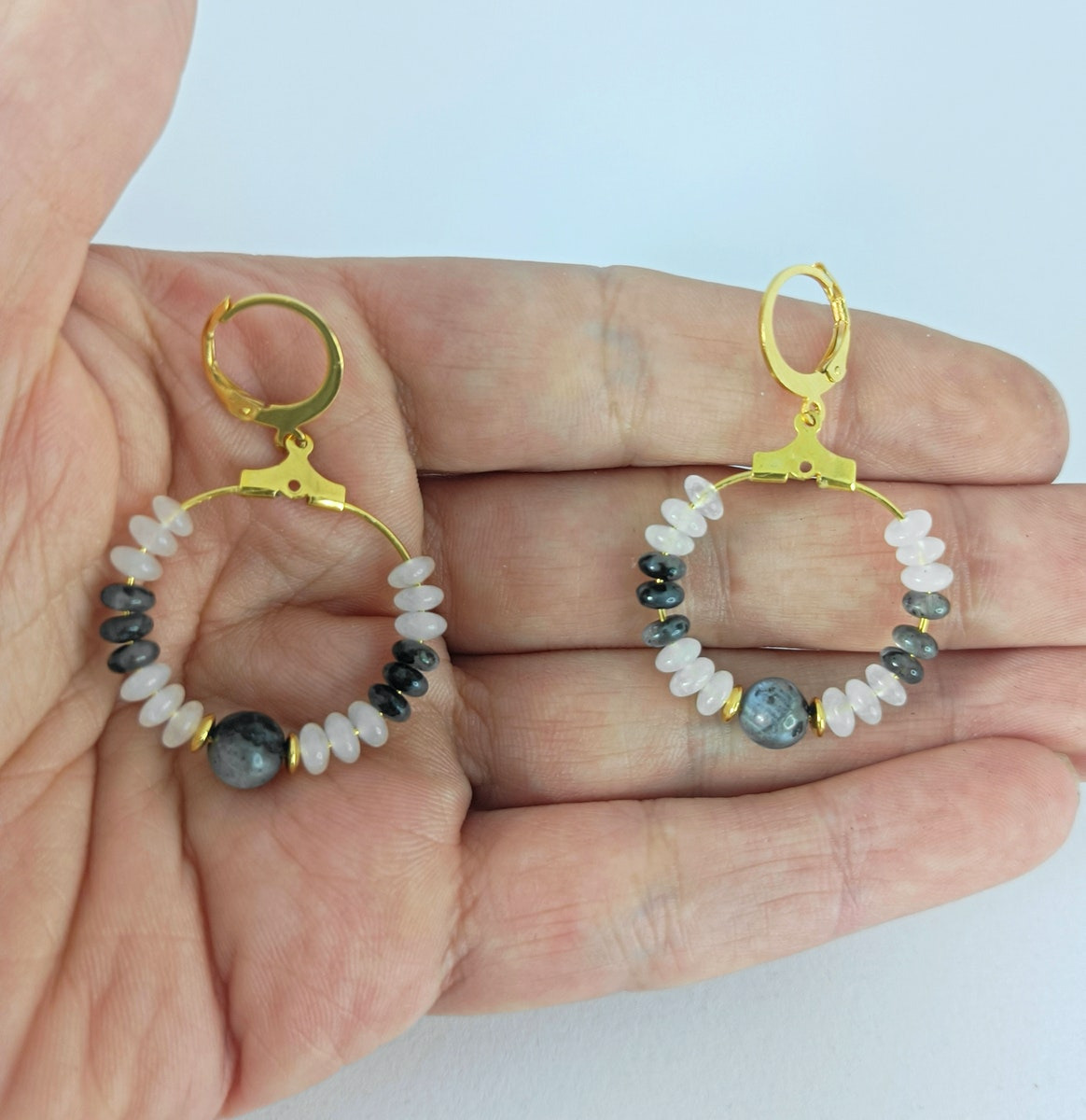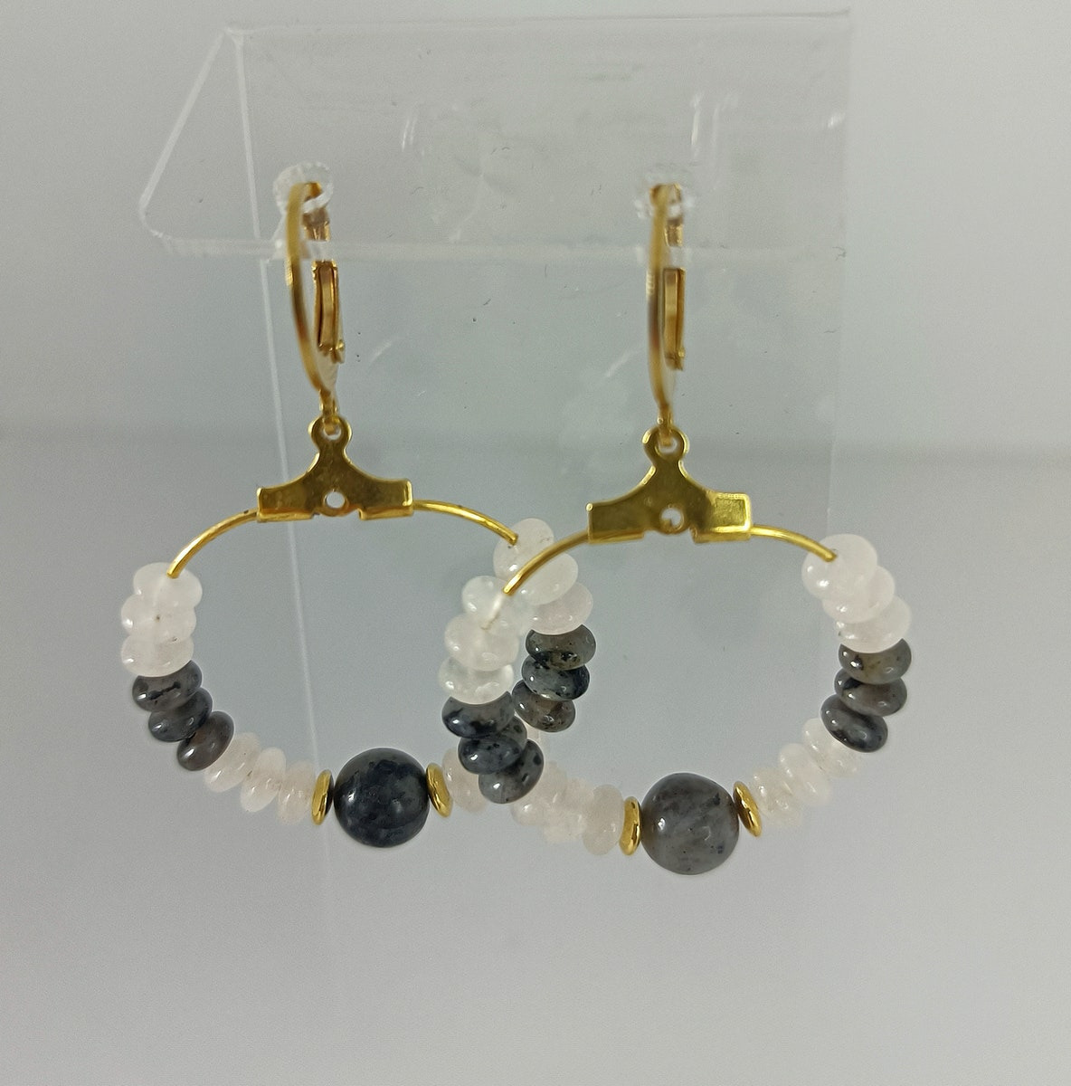 Boucles d'oreilles en perles naturelles de labradorite et quartz rose.