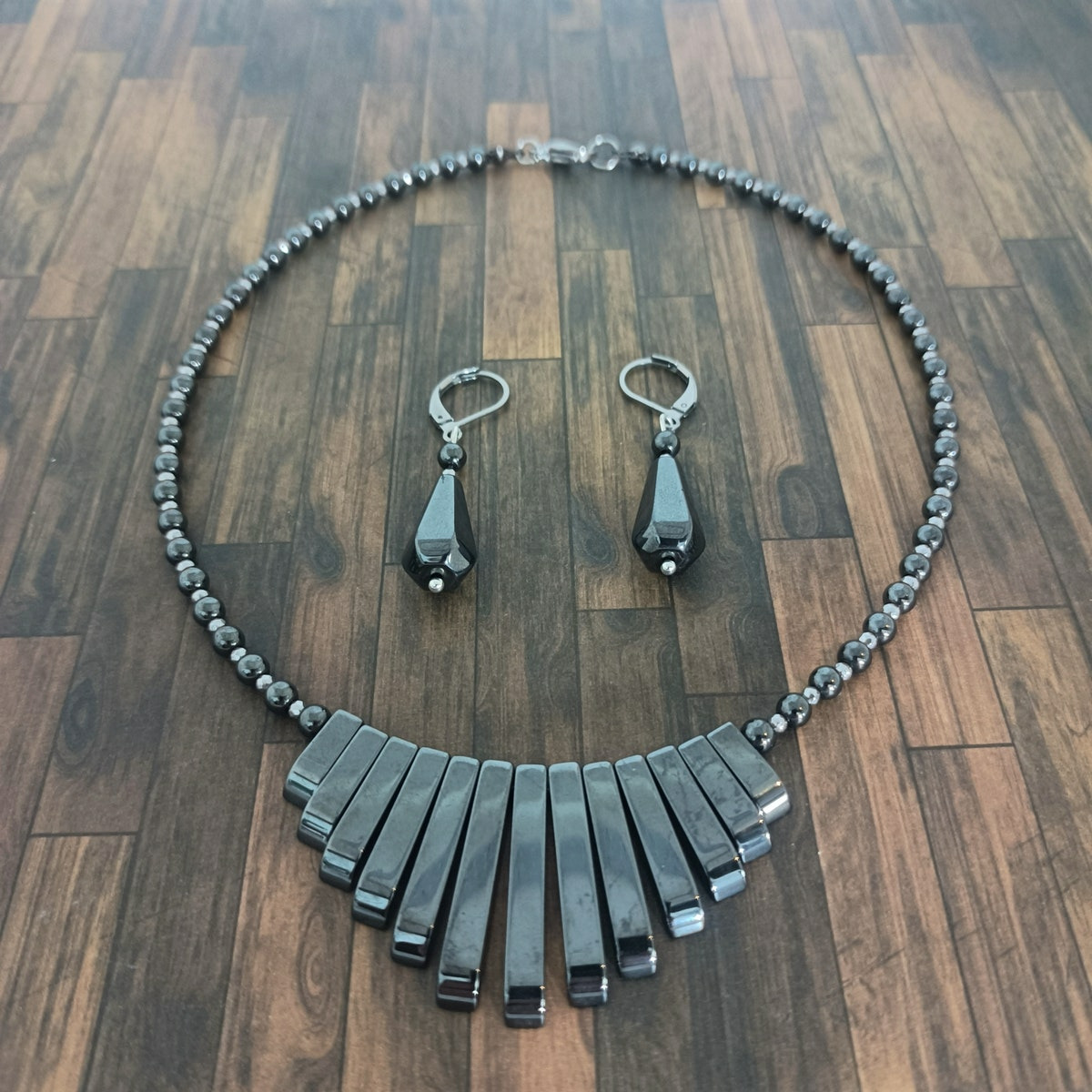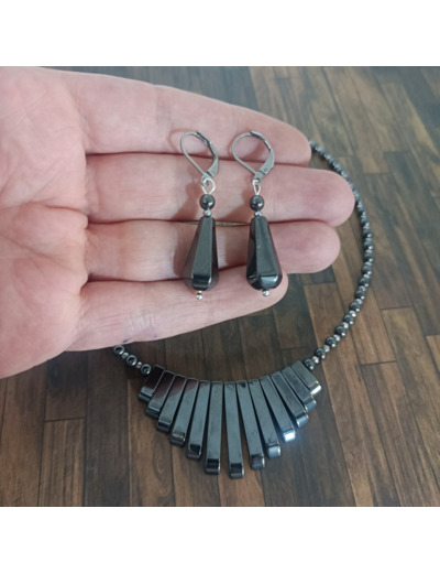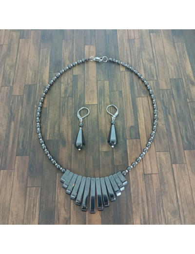 Tour de cou + boucles d'oreilles tout en Hématite.