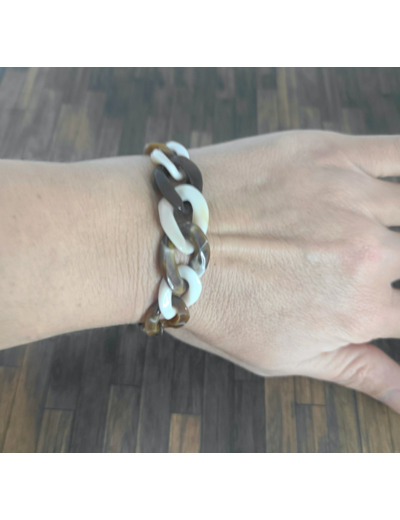 Craquez pour cette magnifique parure hyper tendance, unique, réalisée dans mon atelier avec une chaîne bronze et des anneaux acrylique dans les tons marron/beige.