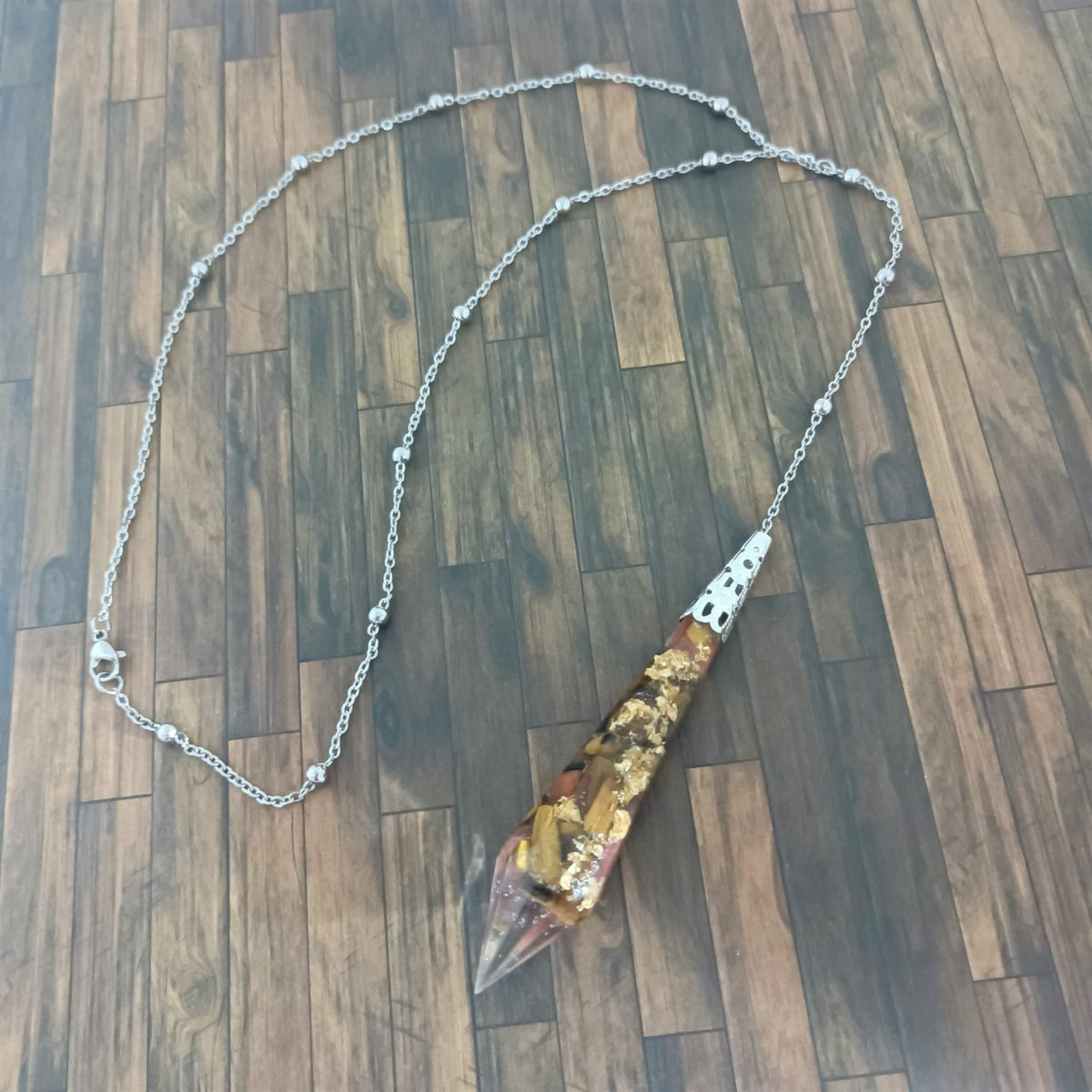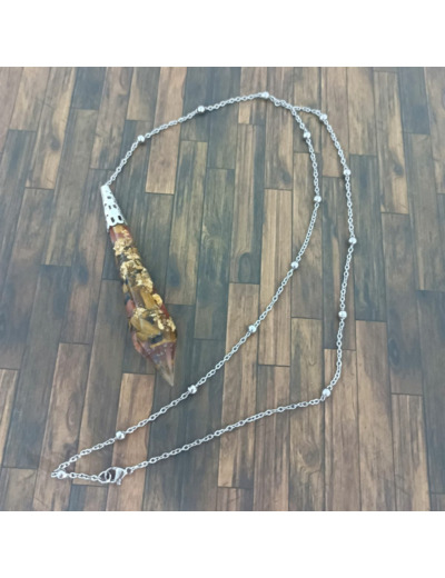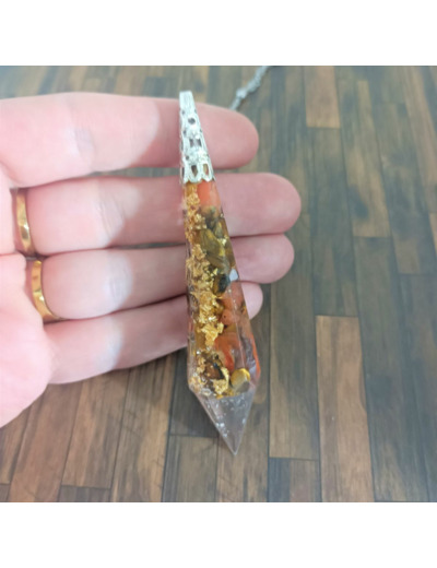Le pendule de radiesthésie orgonite et pierres naturelles est un incontournable pour tous ceux souhaitant apprendre la radiesthésie. Le pendule divinatoire orgone se compose d'une chaîne en acier inoxydable et d'un pendule en orgone renfermant des fragments d'agate orange, d'oeil de tigre et de la feuille d'or.