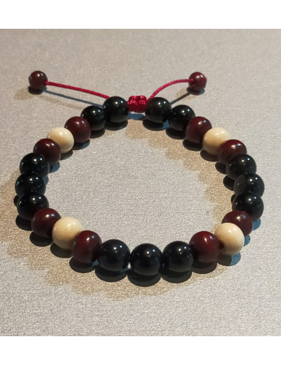 Perles en bois aubergine/blanc + obsidienne noire, ajustable