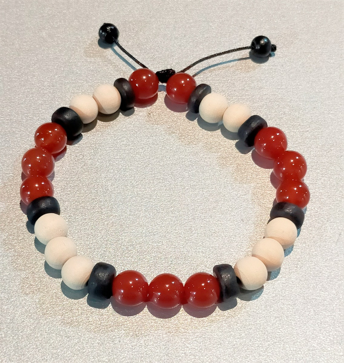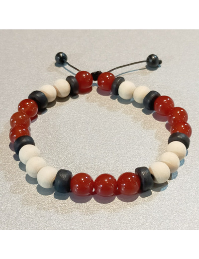 Perles en bois blanc/noir + cornaline, ajustable