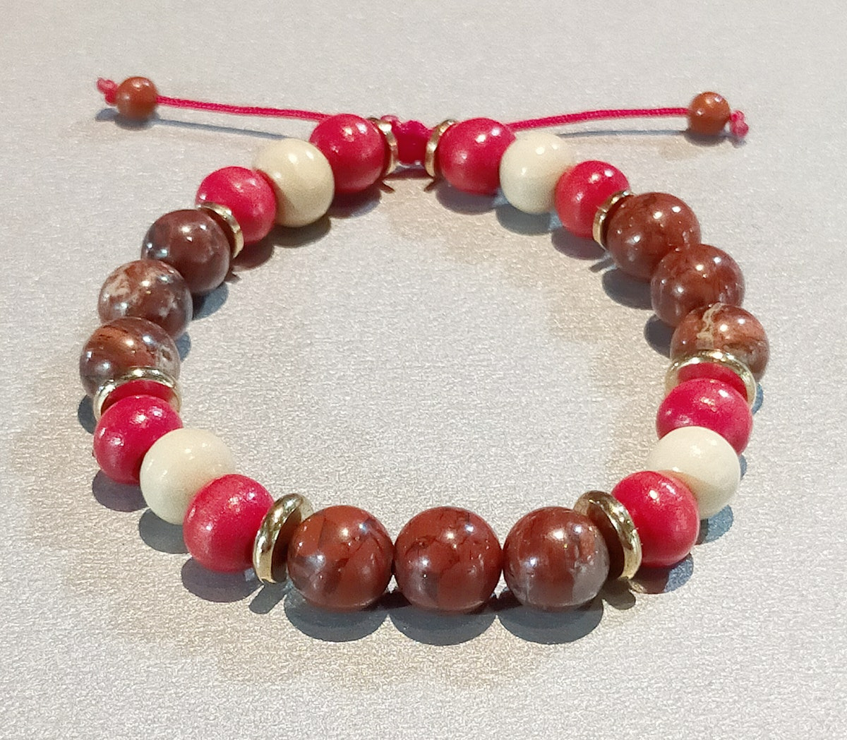 Perles en bois rouge/blanc + jaspe rouge + métal argenté, ajustable