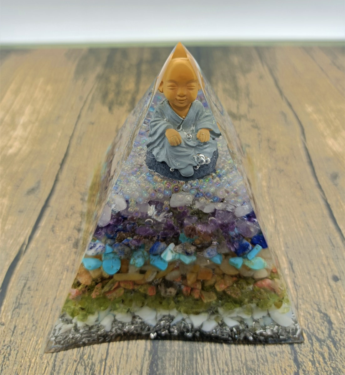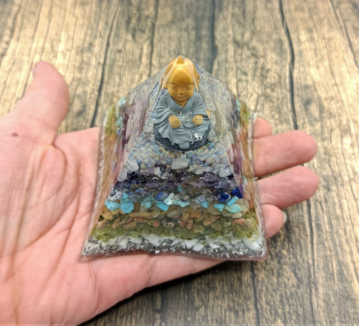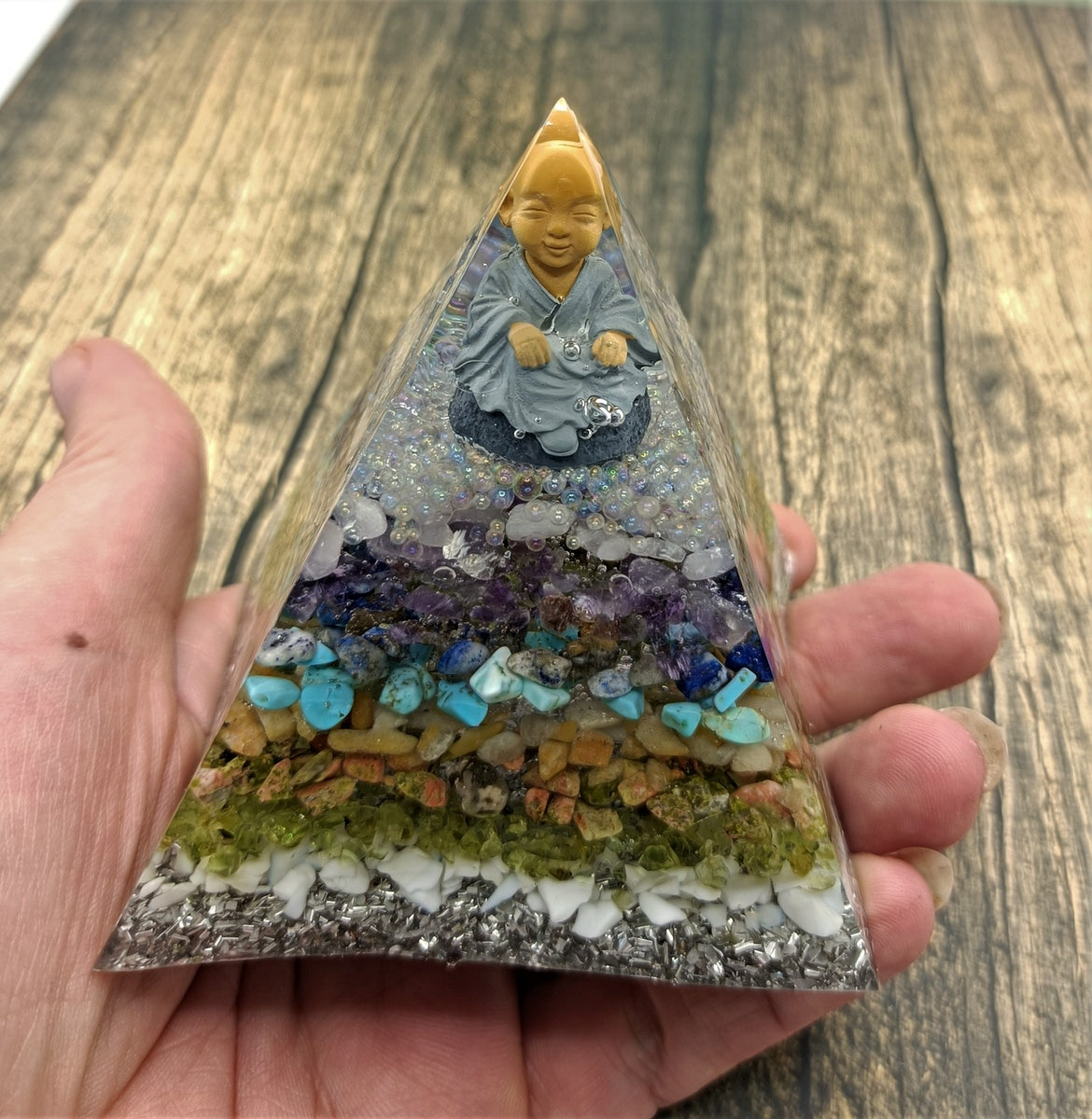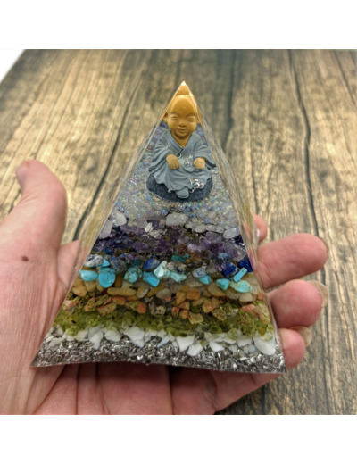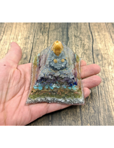 Cette Orgonite se compose d'éclats de pierres naturelles tels que le turquoise, quartz rose, améthyste, unakite, péridot..., des minéraux tel que l'aluminium, des bulles de résine colorées, un bouddha, contenu dans un contenant en résine, le tout dans un rendu absolument magnifique.
