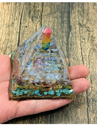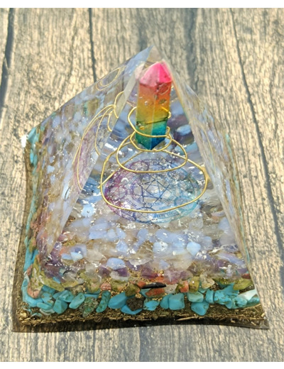 Cette Orgonite se compose d'éclats de minéraux tels que le turquoise, le quartz rose, le cristal blanc, l'unakite, l'améthyste, du cuivre, des bulles de résine colorées, un quartz, un fil de cuivre en spirale, contenu dans un contenant en résine, le tout dans un rendu absolument magnifique.