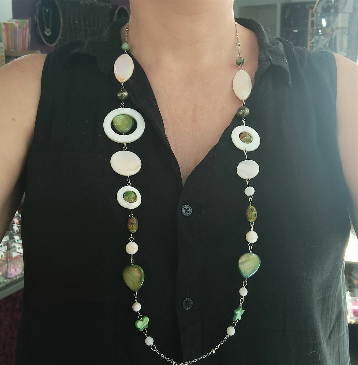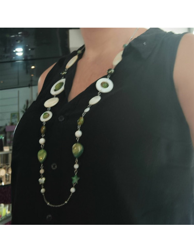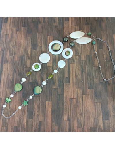 Sautoir en nacre et chaîne acier inoxydable.