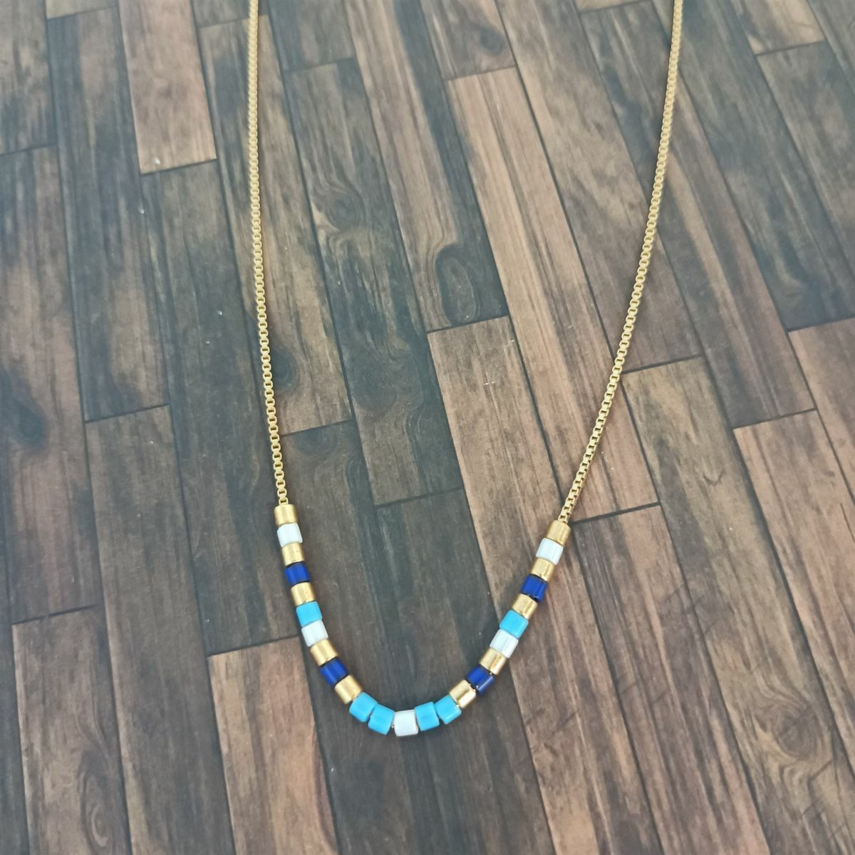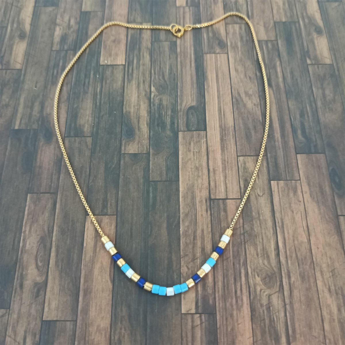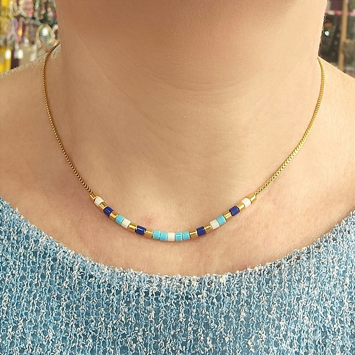Tour de cou chaîne et perles tons bleu