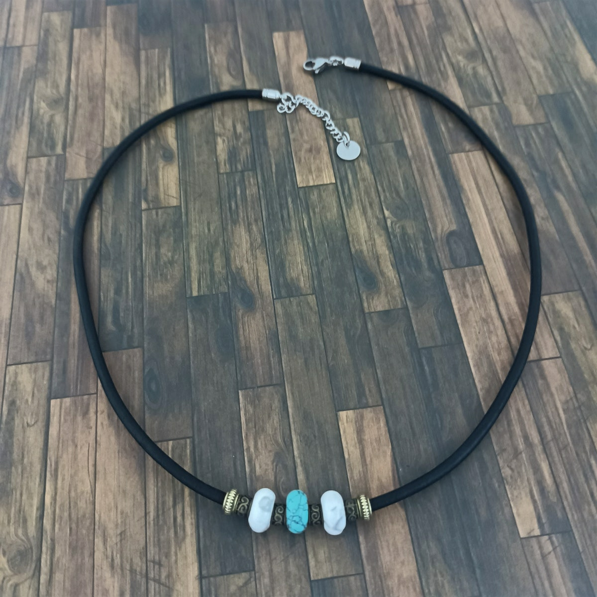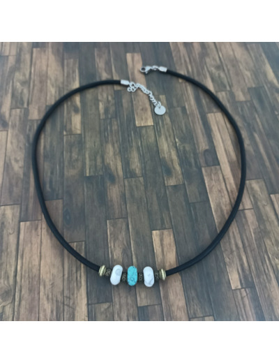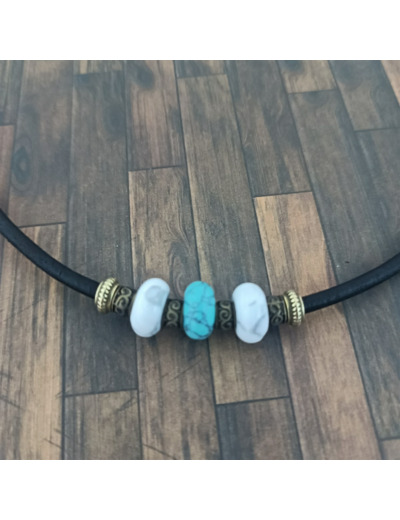 Tour de cou monté sur cordon en cuir véritable, perles naturelles, perles bronze et apprêts en acier inoxydable.