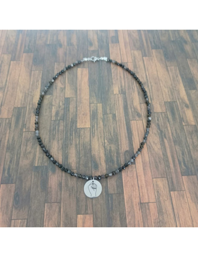 Perles naturelles d'obsidienne facetée et médaille en acier inoxydable.