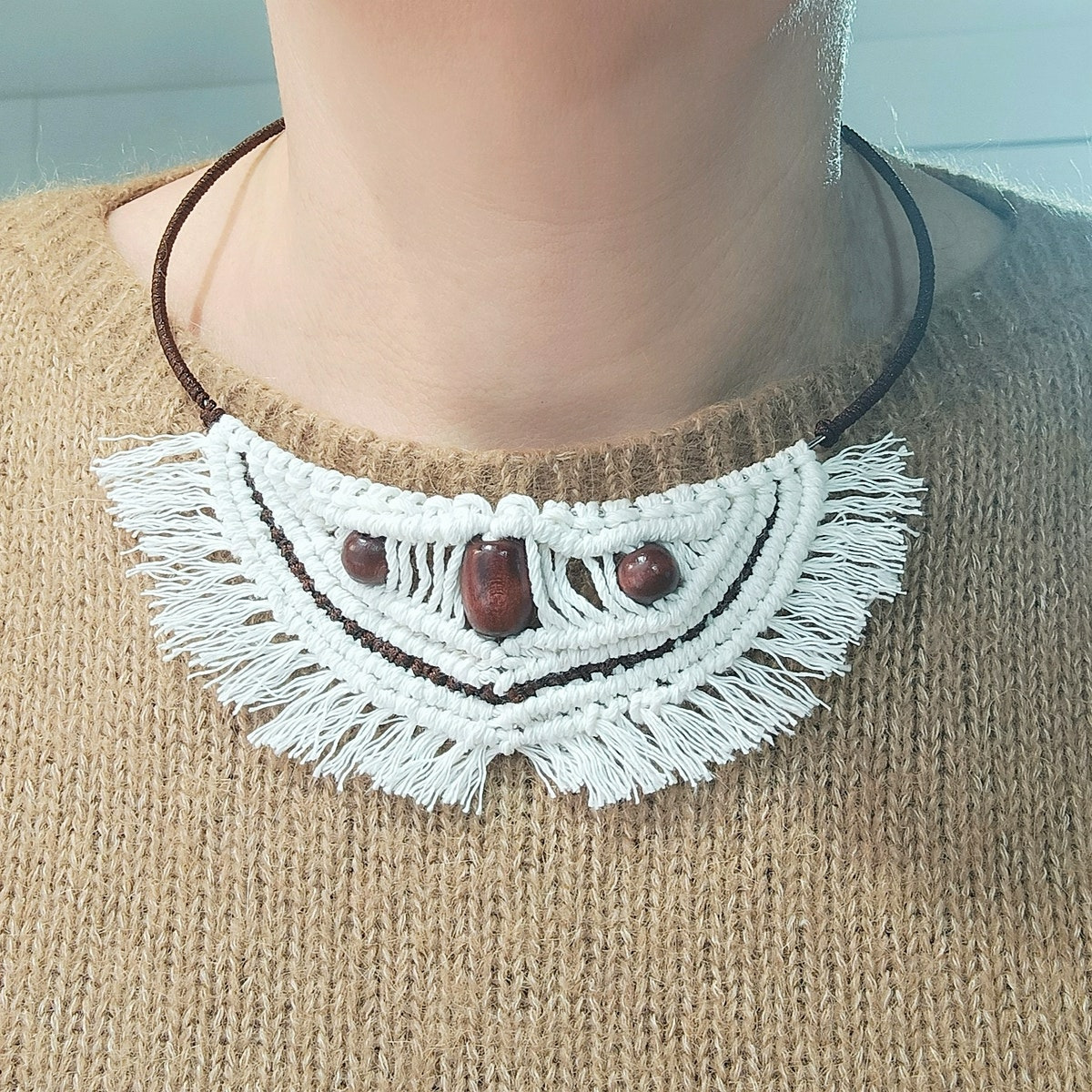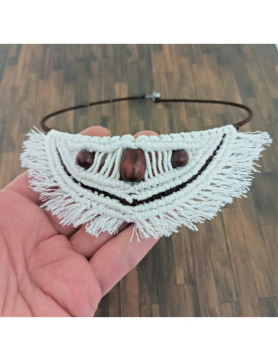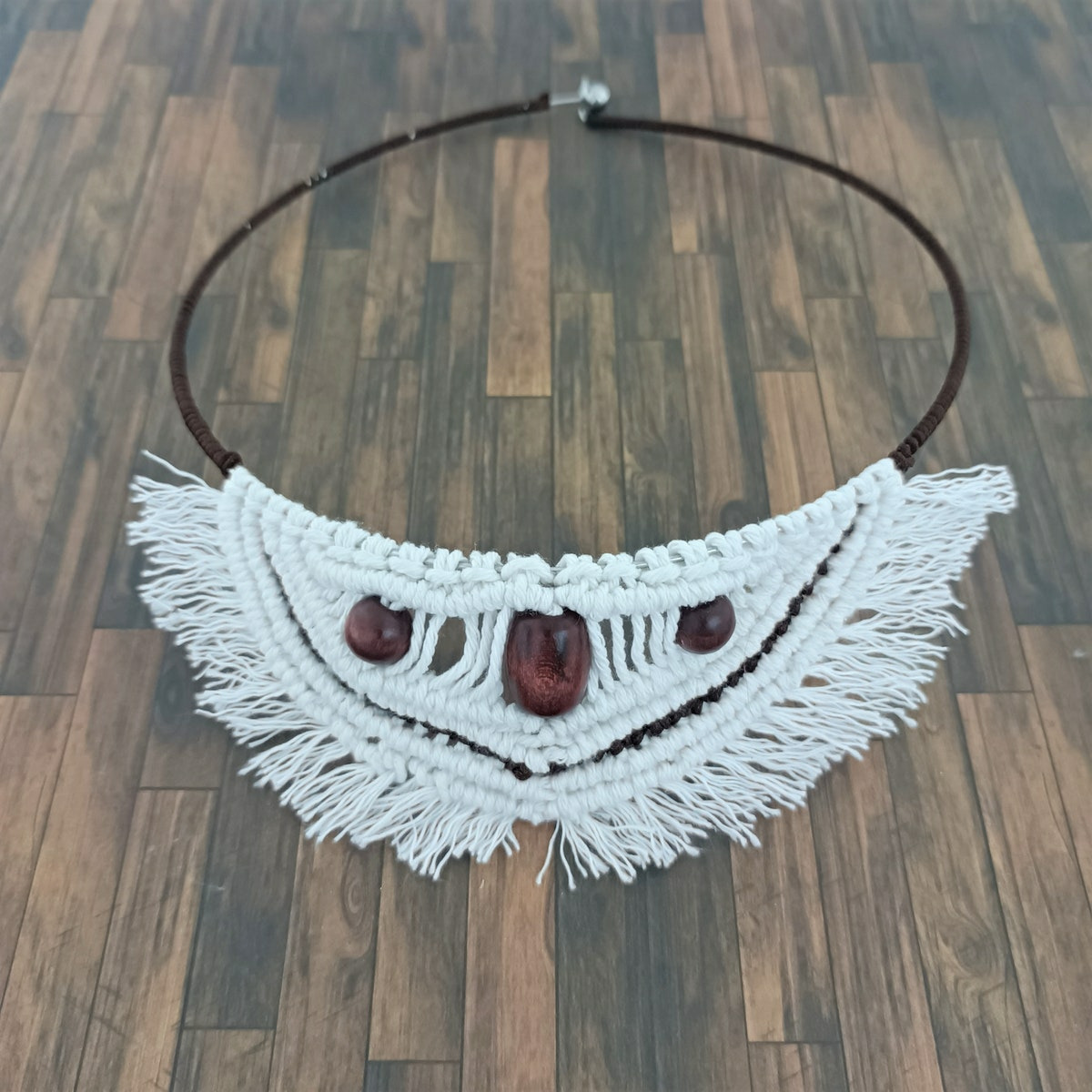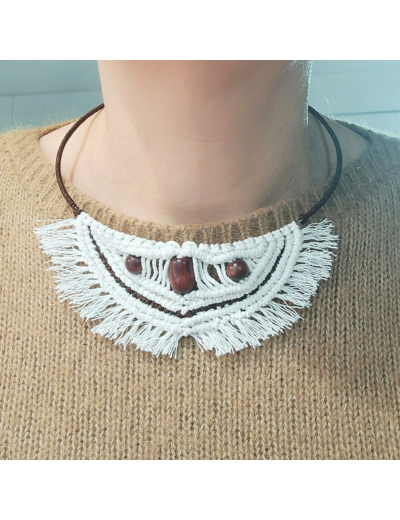 Fil de coton naturel et perles en bois tissé sur un tour de cou en acier inoxydable.