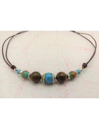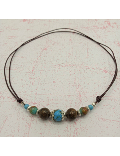 Tour de cou turquoise/bronzite argenté sur cordon marron