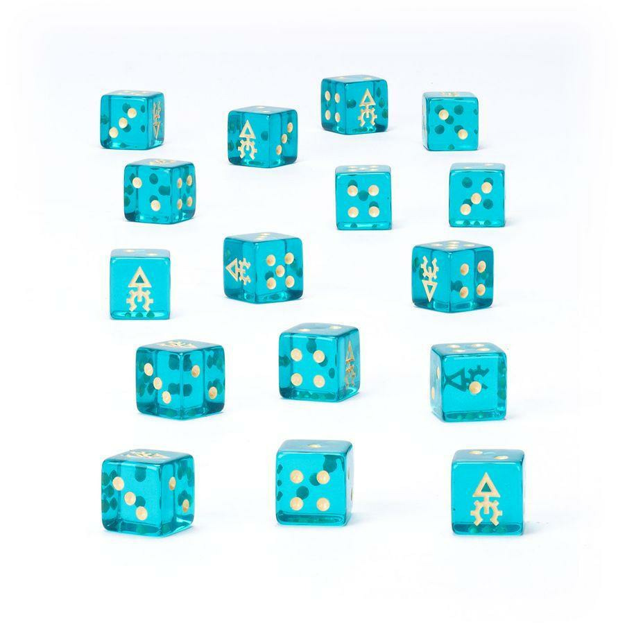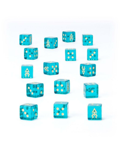 Le set comprend 16 dés carrés à six faces, en plastique acrylique bleu-vert effet gemme, mesurant 16 mm de côté. Les faces 1 à 5 sont marquées en crème, tandis que chaque face 6 porte l’icône pirate des Corsaires Aeldari. Disponibles uniquement dans la limite des stocks.