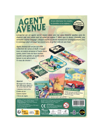 Agent Avenue est un jeu de cartes compétitif pour 2 joueurs qui combine le bluff, course et collection. Incarnez des espions à la retraite planqués dans un quartier de banlieue, au sein d’un monde anthropomorphique coloré. Votre but ? Démasquer votre voisin et prouver que c’est un espion en vous livrant à une course tactique d’anthologie.