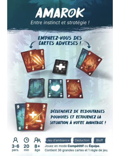 Amarok développe votre sens de l’observation, aiguise votre esprit critique et renforce votre capacité à collaborer sous pression. Il offre des parties rapides et rythmées, idéales pour animer vos soirées entre amis ou en famille, tout en stimulant votre réflexion et votre esprit d’équipe.