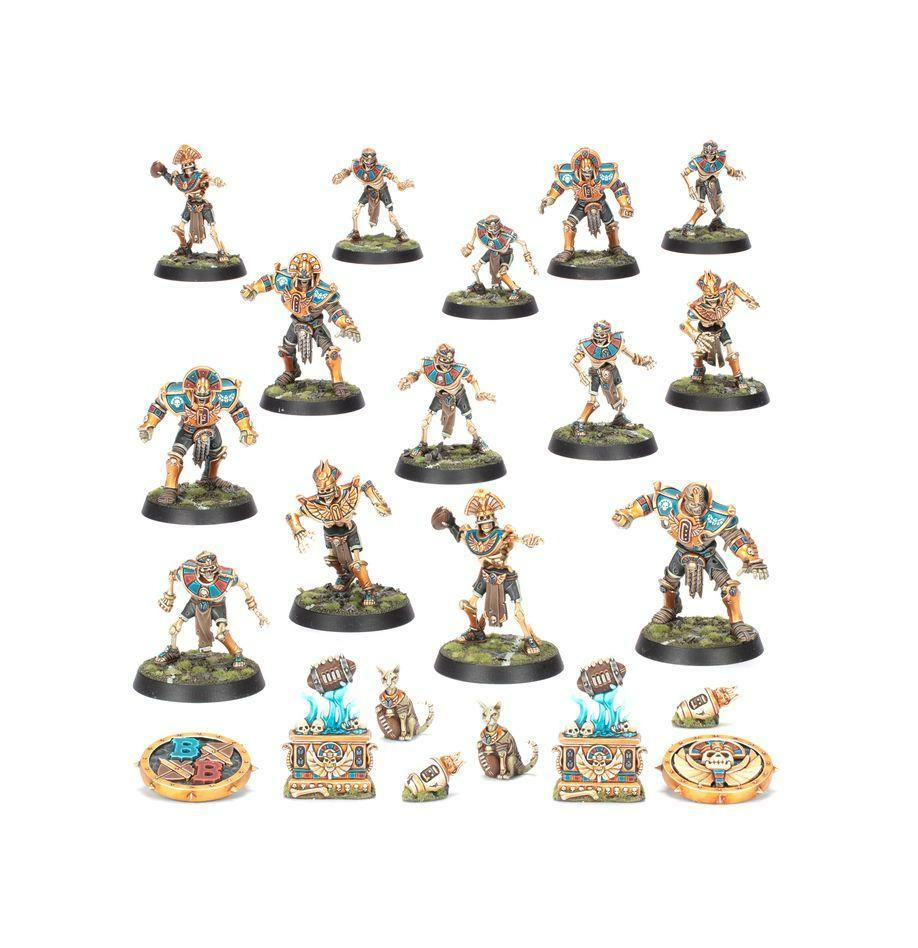– 14 joueurs Rois des Tombes en plastique de couleur os: 2x Blitzers, 2x Lanceurs, 4x Gardiens des Tombes et 6x Trois-quarts Squelettes, ainsi que des pions, des marqueurs de Relance, et des ballons supplémentaires