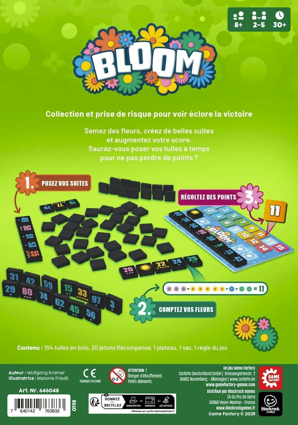 Bloom convient à tous les joueurs à partir de 8 ans, parfait pour les familles et les amateurs de jeux de stratégie accessibles.