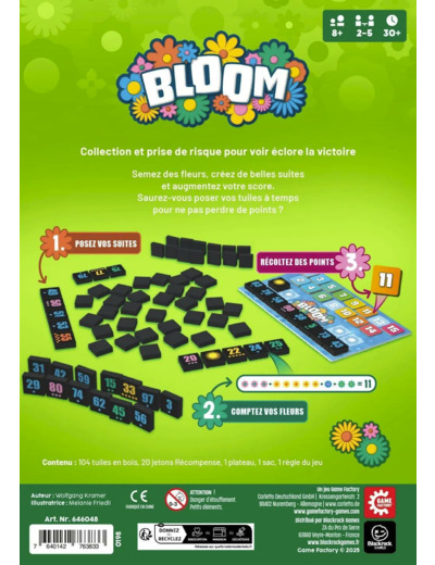 Bloom se joue en posant ou piochant des tuiles pour créer des suites numériques, en récupérant des jetons fleurs et en gérant les risques liés aux tuiles non posées.