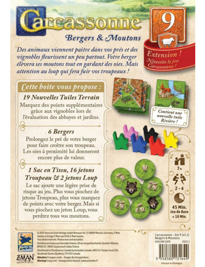 Avec l'extension Bergers & Moutons, installez des vignobles dans vos prés, puis laissez votre berger élever son troupeau de moutons pour amasser plus de points. Vous pouvez piocher 1 jeton dans le sac en tissu mais attention à ne pas prendre trop de risques : lorsqu’un jeton loup est tiré, tous vos moutons s’enfuient. Vous pourrez aussi élever des oies pour obtenir des points supplémentaires.