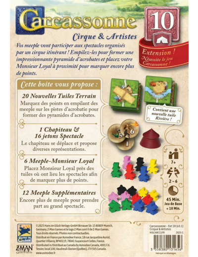 Avec l'extension Cirque & Artistes, vos meeple deviennent des artistes de cirque, prêts à se produire en ville, sur les routes ou les prés pour divertir la population... et vous faire marquer toujours plus de points ! Cette extension amusante repose sur deux mécaniques originales. D’abord, les tuiles Acrobatie vous permettent d’empiler vos meeple pour former une pyramide humaine. Dès que trois acrobates se retrouvent sur la même tuile, ils peuvent être évalués pour rapporter 5 points chacun. Ensuite, les tuiles avec piste de cirque accueillent un jeton Spectacle caché, qui sera révélé plus tard pour attribuer des points aux meeple situés autour.