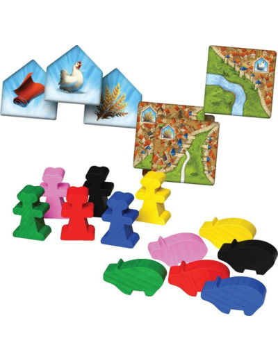 24 tuiles Terrain, 1 tuile Rivière avec symbole Marchandise, 6 cochons, 6 bâtisseurs, 20 jetons Marchandise (9 volaille, 6 blé, 5 tissu), Règle du jeu.