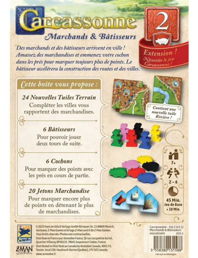 Avec l'extension Marchands & Bâtisseurs, de nouveaux objectifs s’invitent à la table. Collectez des marchandises précieuses, accélérez vos constructions et optimisez votre présence dans les prés pour marquer toujours plus de points. Compléter les villes vous rapportent des marchandises : amassez-en le plus du même type pour marquer des points bonus en fin de partie. Le bâtisseur vous permettra d’accélérer la construction de vos routes et de vos villes en jouant 2 tours de suite. Quant aux cochons, ils s’attachent à vos paysans dans les prés. À chaque ville avec blason complétée, vous marquez 3 points par ville adjacente au pré occupé par votre cochon.