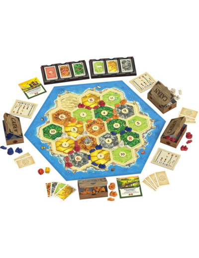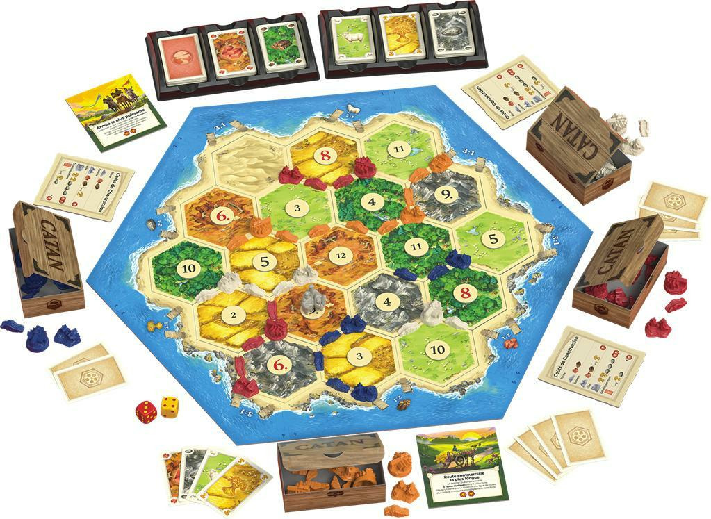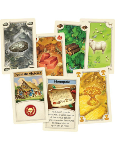 Observez votre environnement et installez-vous sur des emplacements stratégiques de l’île. Utilisez les ressources que vous obtiendrez - argile, bois, laine, blé, minerai - pour prendre possession des terres en construisant des routes et des villes. Les ressources seront produites par les différents terrains de l’île en lançant des dés, mais vous pourrez aussi en obtenir en faisant du commerce avec vos adversaires. Mais attention à eux ! Ils pourraient s’approprier les meilleurs emplacements avant vous, faire appel à des voleurs pour vous dépouiller de vos ressources durement gagnées et bloquer votre production.