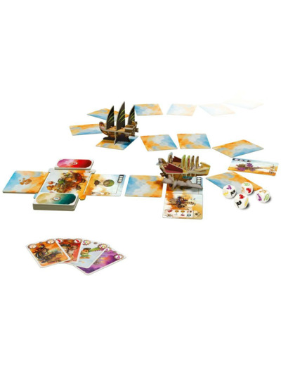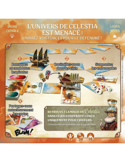 L’univers de Celestia s’étend dans ce jeu coopératif pour 2 joueurs à communication limitée mêlant course-poursuite, prise de risque et stratégie. Durant votre périple, partagez-vous judicieusement les cartes pour déjouer les embuscades. Anticipez la main de votre partenaire car si l'un de vous, à son tour, ne peut pas combattre un dé, l’aéronef subira un dommage. Faites étape au bon moment dans les cités volantes pour vous ravitailler et recruter des passagers aux capacités bien utiles... Au risque de laisser filer le chef des pirates !