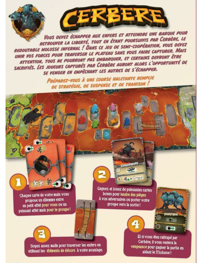 À votre tour, jouez au minimum 1 carte. Sur les cartes, choisissez entre : vous avantager un peu au détriment du groupe, ou bien avantager le groupe mais en restant sur place. Si tout le monde privilégie l’entraide, il devient plus facile d’échapper à Cerbère. Mais souvent, il est trop tentant d’avancer seul et de laisser ses compagnons en pâture à la bête.