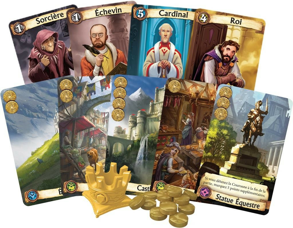 Le coffret contient 27 cartes Personnage, 84 cartes Quartier, 27 jetons Personnage, 5 jetons divers, 1 couronne en plastique, 6 cartes d’aide de jeu, 30 pièces d’or en plastique et un livret de règles complet. Adapté aux joueurs dès 10 ans, il promet des parties dynamiques et variées.