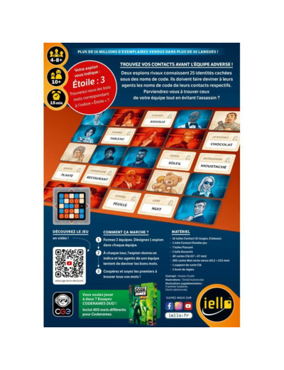Vendu à + de 15 millions d’exemplaires à travers le monde, Codenames est un jeu d’association d’idées et de communication, pour 2 à 8 joueurs. Le but du jeu est de faire reconnaître les mots de votre équipe... en évitant les mots neutres, les mots de l’équipe adverse ou – pire encore -, le mot assassin qui vous fait perdre immédiatement !