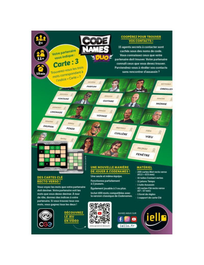 Codenames Duo est un jeu d’association d’idées pour 2 joueurs dans lequel, les 2 joueurs incarnent un maître-espion, et l'agent en mission. Pour retrouver sous quel nom de code se cachent vos informateurs, écoutez bien les indices donnés et prenez garde à ne pas contacter un informateur ennemi, ou pire... le redoutable assassin !