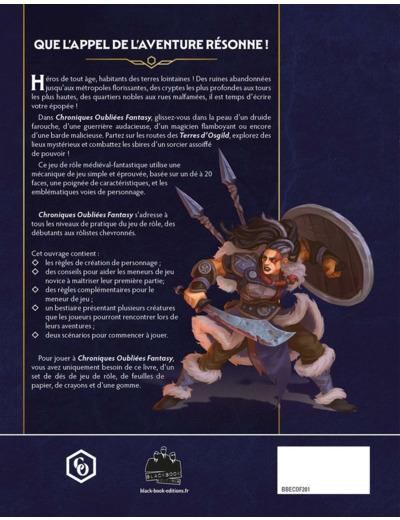 Chroniques Oubliées Fantasy est un jeu de rôle médiéval-fantastique pour les débutants, mais aussi les rôlistes expérimentés. Il utilise une mécanique de jeu simple et éprouvée, basée sur le d20, une poignée de caractéristiques, et les emblématiques voies de personnage.