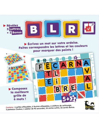À chaque tour, on révèle 3 lettres, associée chacune à une couleur, ainsi qu'une condition à satisfaire pour gagner le Bonus : thématique, nombre de lettres, première lettre imposée, cases de couleurs...