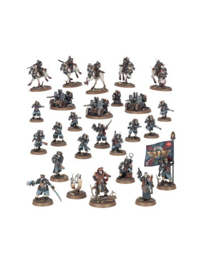 Cette boîte permet d'assembler 26 figurines en plastique de l'Astra Militarum: