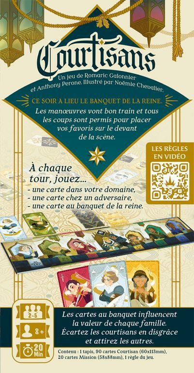 À votre tour vous jouez 3 cartes Courtisans, chacune représentant une des familles de la cour royale. Deux de ces cartes sont placées chez vous et chez un adversaire afin de constituer des collections. La dernière est jouée à la table de reine afin d'influencer chaque famille : placez une carte au-dessus ou au-dessous du plateau pour donner une valeur positive ou négative à la famille correspondante. Les retournements de situations sont légions car certains Courtisans ont des rôles spécifiques. Des espions pourraient se glisser dans votre jeu et rendre l'issue incertaine. À moins que des assassins viennent vous retirer les cartes vous rapportant le plus. Pour obtenir le plus de points et l'emporter, vous devrez collectionner les bonnes familles tout en préservant leur valeur à la table de la reine.
