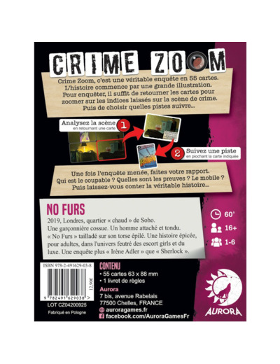Dans Crime Zoom, vous mènerez votre enquête librement. Discutez entre joueurs pour choisir les pistes à suivre. Et dès que vous pensez avoir résolu l’enquête, rendez-vous au questionnaire. Qui est le coupable ? Quel est son mobile ? Quelle est l’arme du crime ? Et quelques questions subsidiaires bien évidemment….