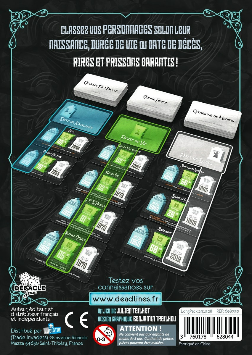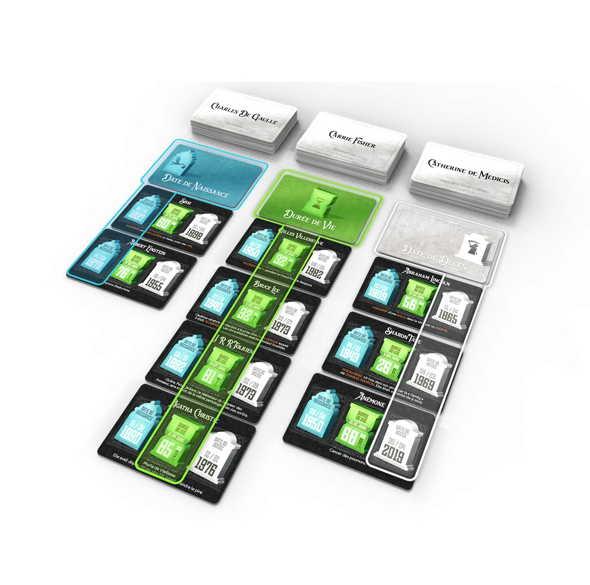À chaque tour, choisissez une carte parmi trois piles et placez-la dans la colonne correspondant à sa date de naissance, de décès ou à sa durée de vie. Le suspense monte lorsque vous devez deviner la position exacte de la carte face cachée. Une erreur vous pénalise, mais des cartes spéciales vous offrent des opportunités pour retourner la situation en votre faveur. Ce jeu mêle réflexion, mémoire et rapidité dans une ambiance conviviale et stimulante.